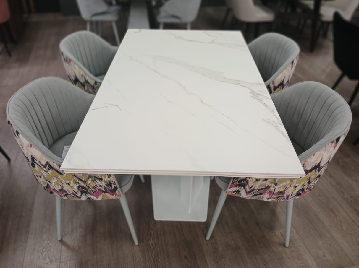 Стол обеденный "Милан" раскладной (КЕРАМИКА БЕЛЫЙ МРАМОР / БЕЛЫЙ МУАР. Размеры 1600 - 2200 мм * 900 мм 760 мм)