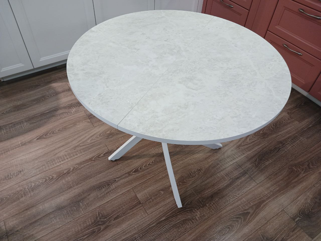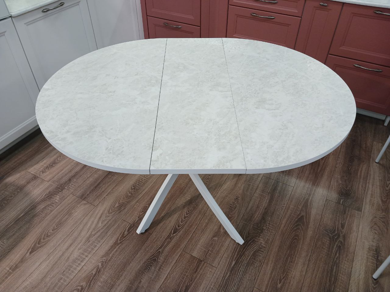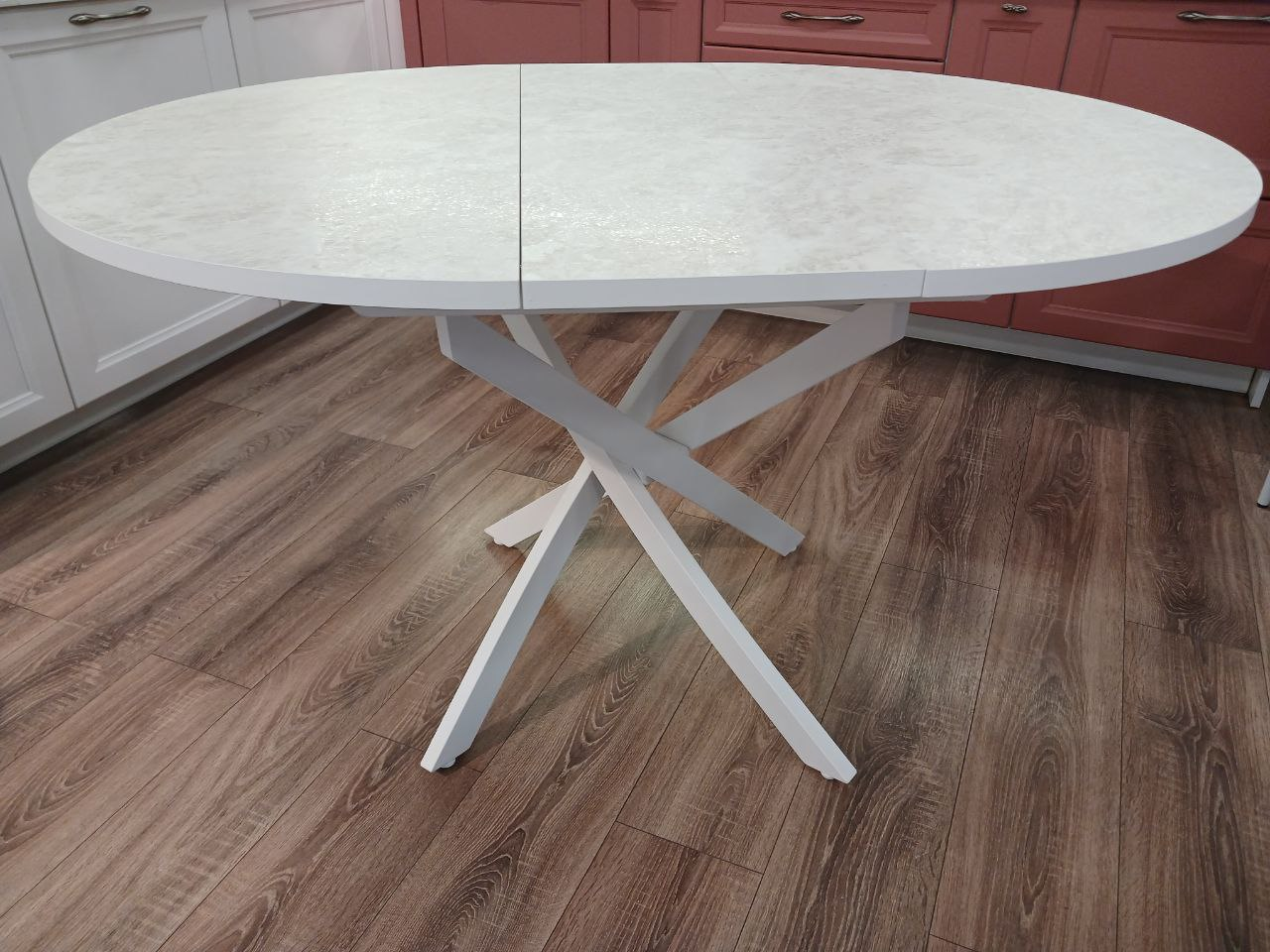 Стол обеденный "Стайл 24" раскладной (КОРОЛЕВСКИЙ ОПАЛ СВЕТЛЫЙ 707 ТС / БЕЛЫЙ МАТОВЫЙ. Размер 1000-1300 мм * 1000 мм * 750 мм)